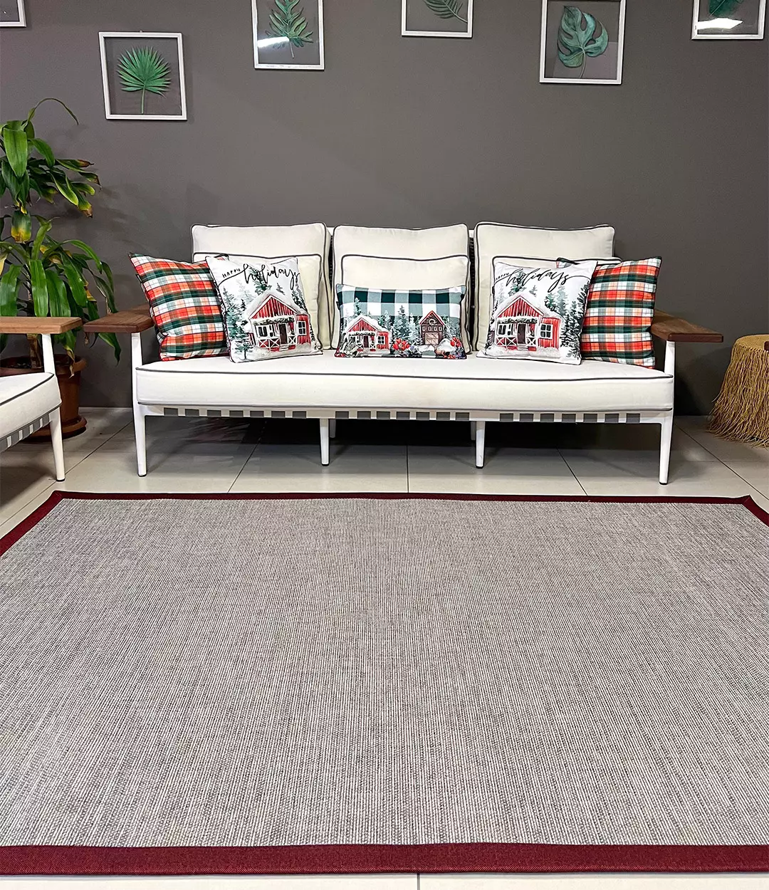 Sisal İç ve Dış Mekan Kullanıma Uygun Dokuma Gri Halı Bordo Bordürlü 4025/15